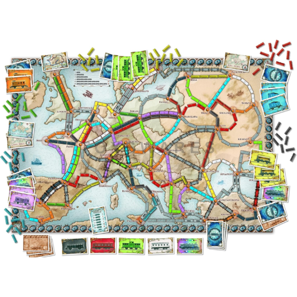 Build train routes across Europe, complete destination tickets, and earn the most points to win.